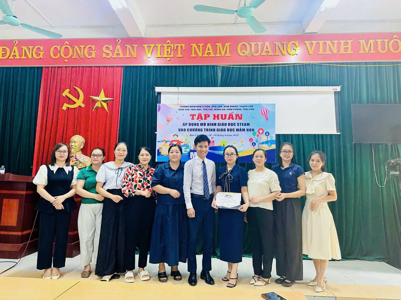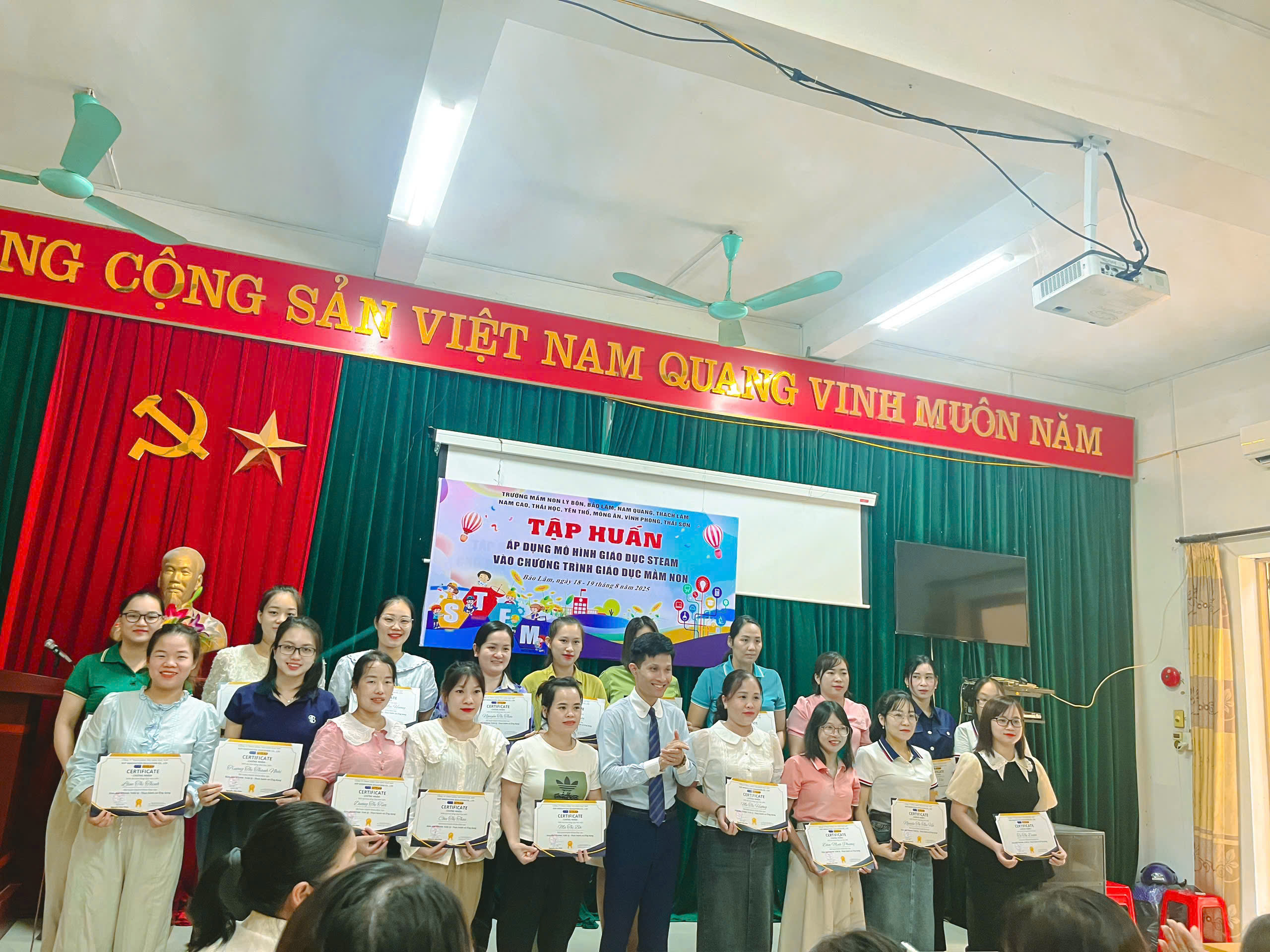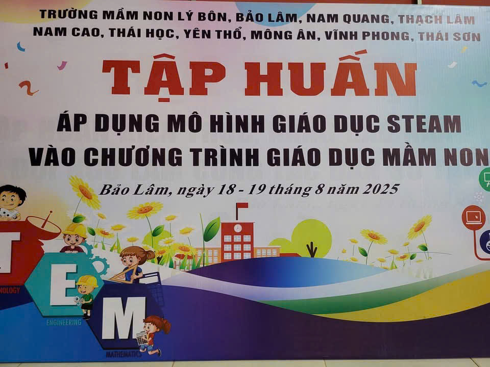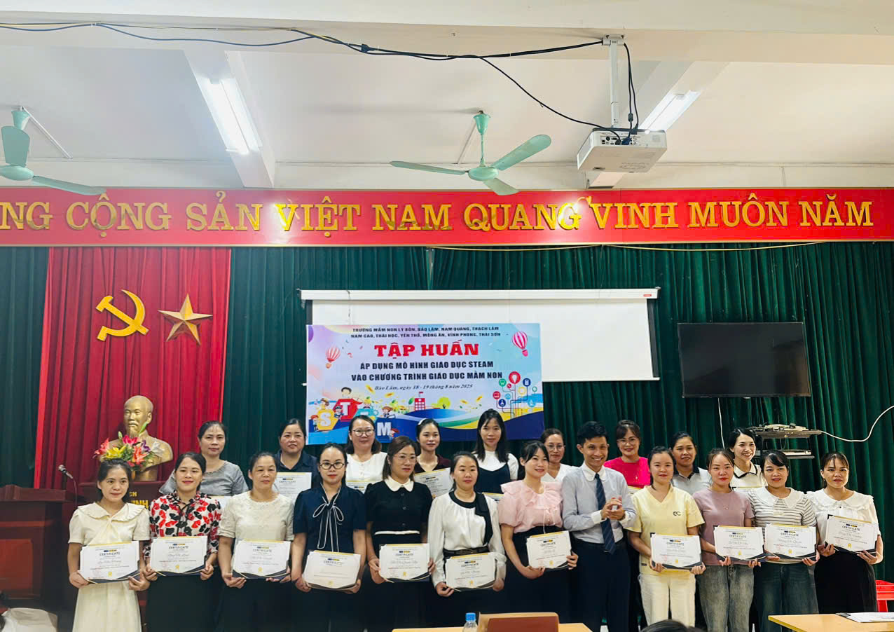 Nhằm nâng cao chất lượng giáo dục trẻ trong bối cảnh đổi mới giáo dục, ứng dụng phương pháp giáo dục tiên tiến, ngày 18 và 19 tháng 8 năm 2025, tập thể cán bộ quản lý, giáo viên trường Mầm non Nam Quang cùng với các cán bộ quản lý, giáo viên một số đơn vị trường mầm non khu vực Bảo Lâm đã có đợt học tập đầy hứng khởi cùng thầy giáo – chuyên viên STEAM Nguyễn Văn Phúc về việc áp dụng mô hình giáo dục STEAM trong chương trình giảng dạy mầm non. Qua đợt học tập đã giúp nâng cao trình độ chuyên môn, nghiệp vụ, rèn luyện kỹ năng chia sẻ và tư vấn, hỗ trợ đồng nghiệp trong việc đáp ứng các yêu cầu của tiêu chí đạt chuẩn nghề nghiệp. Đồng thời tạo sân chơi giao lưu, học hỏi kinh nghiệm và hoàn thiện các khâu trong công tác quản lý, chỉ đạo và tổ chức thực hiện các hoạt động giáo dục, góp phần nâng cao chất lượng xây dựng trường mầm non lấy trẻ làm trung tâm.